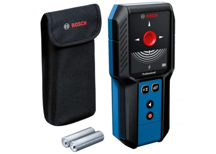 Bosch GMS 120-27 Professional з фірмовим чохлом — універсальний детектор прихованих комунікацій і матеріалів: сталевих і кольорових металів, «живих» проводів та дерев’яних балок. Забезпечує безпечне свердління й монтаж у будь-яких стінах завдяки максимальній глибині виявлення до 120 мм.