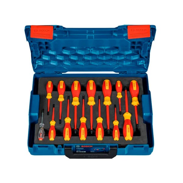 Набір викруток Bosch Professional VDE SL, PH, PZ, TX з однополюсним індикатором фази з 14 предметів призначений для виконання електромонтажних робіт, закручування та відкручування гвинтів під напругою, а також для безпечної перевірки наявності фази. У комплекті 13 ізольованих викруток (SL 2.5 / 3.5 / 5.5 / 6.5 мм, PH1, PH2, PZ1, PZ2, SL/PZ1, SL/PZ2, TX10, TX15, TX20) і однополюсний фазовий індикатор, які витримують випробування до 10000 В та сертифіковані VDE до 1000 В згідно з DIN EN/IEC 60900. Поставляється в кейс L-BOXX 102.