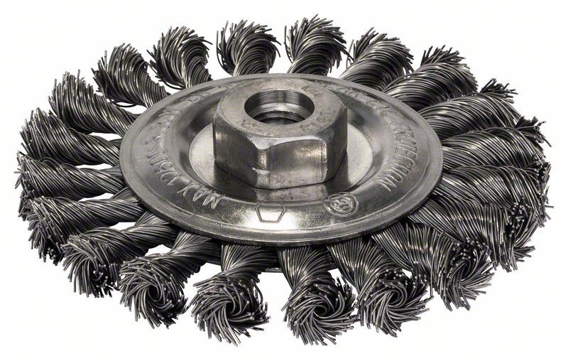 Опис виробу, каталог приладдя, сірийДля сложных работ по очистке с высокой окружной скоростью на металлических поверхностях малой площади, в пазах или кромках, например, удаления толстых слоев ржавчины, снятия лакокрасочного покрытия, удаления шлака, заусенцев, окалины., Кольцевая щетка – пучки витой проволоки, Оптимально подходит для очистки сварных швов., Підходить для усіх кутових шліфмашин з різьбою M 14