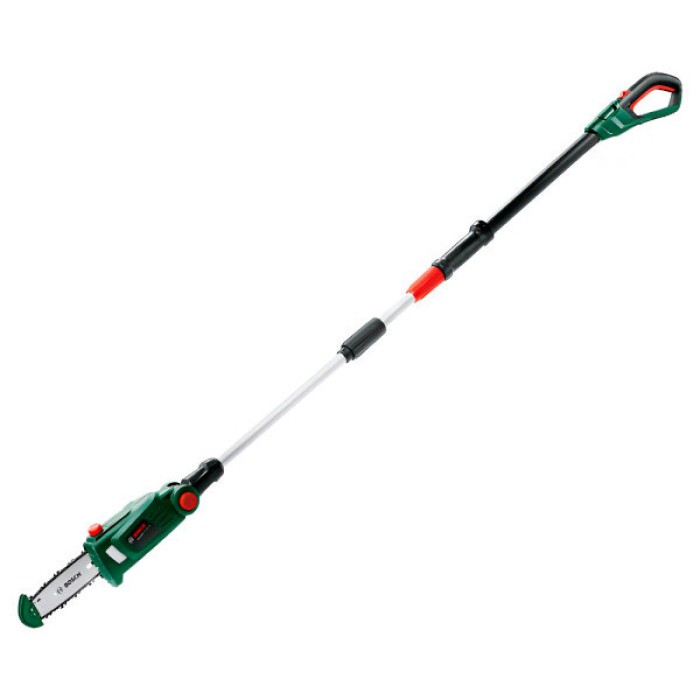 Акумуляторна телескопічна висоторізна пила Bosch UniversalChainPole 18 - компактний і легкий (3.3) інструмент, призначений для обрізання гілок і догляду за деревами та чагарниками. Оснащений надійним електродвигуном, телескопічною штангою, що регулюється в межах 2.1- 2.6 м, автоматичною системою змащення ланцюга, з масляним бачком 60 мл, шиною завдовжки 200 мм, якісним ланцюгом Oregon з 33 ланками, регульованою голівкою пили (до 120°) та зручним руків'ям з протиковзким покриттям. Працює від Li-Ion акумулятора 18V (не йде в комплекті). Швидкість ланцюга становить 4 м/с. Розмір інструменту 2100x125x170 мм, вага 3.3 кг.