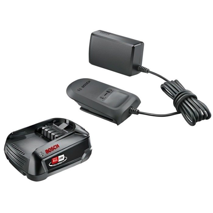 Надійні джерела живлення підходять для акумуляторних інструментів Bosch Professional 18V. У комплект входять потужна батарея ємністю 2.5 Ah та пристрій, який забезпечує швидке та ефективне заряджання акумулятора напругою 18 В. Час заряджання на 100% становить 80 хв.